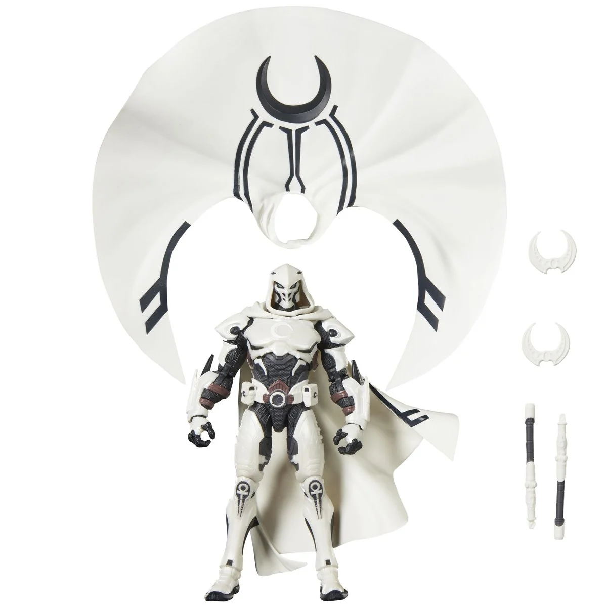 The Moon Knight figure is inspired by his appearance in the Marvel Rivals video game where Super Heroes and Super Villains from across the Marvel Multiverse use their incredible abilities to battle. Hasbro Marvel Legends action figure come with 5 accessories including 2 crescent darts, 2 billy clubs and an alternate moon-shaped cape. Ages 4 and up.