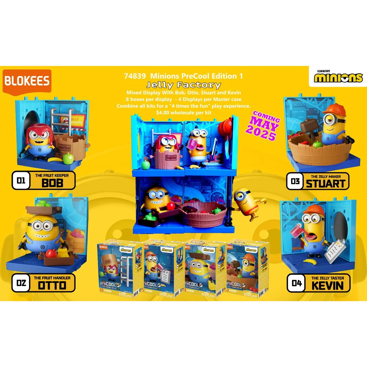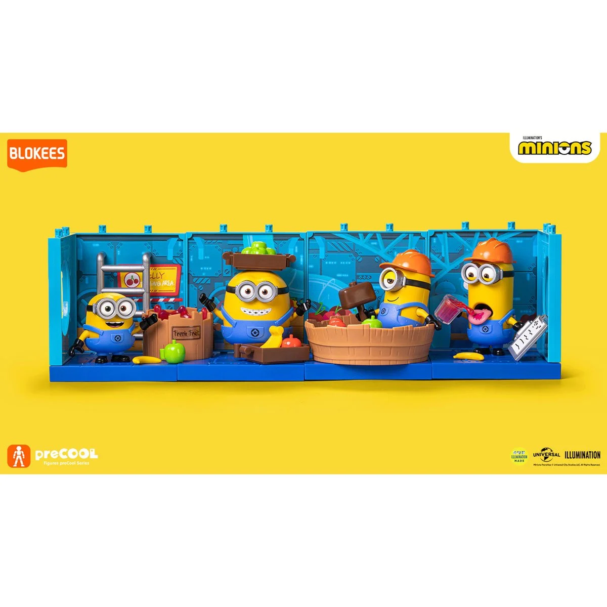 Build your favorite Minions with the officially licensed preCOOL Jelly Factory Series! Each character (Bob, Otto, Stuart, or Kevin) features spinning eyes, poseable bodies, and exclusive accessories that snap together in minutes. With just 27-31 pieces per model kit and standing 1 3/4 to 3-inches tall, these adorable troublemakers are perfectly sized for small hands and big imaginations. Spark Joy when you collect all four sets! Connect them to create the complete Jelly Factory with modular scene panels that can be arranged horizontally or vertically for endless layout possibilities. Watch Bob struggle with spilled jelly, Stuart smash fruit in his bowl, Otto stack apples, and Kevin taste-test the final product each with their exclusive themed props and customizable dress-up options.