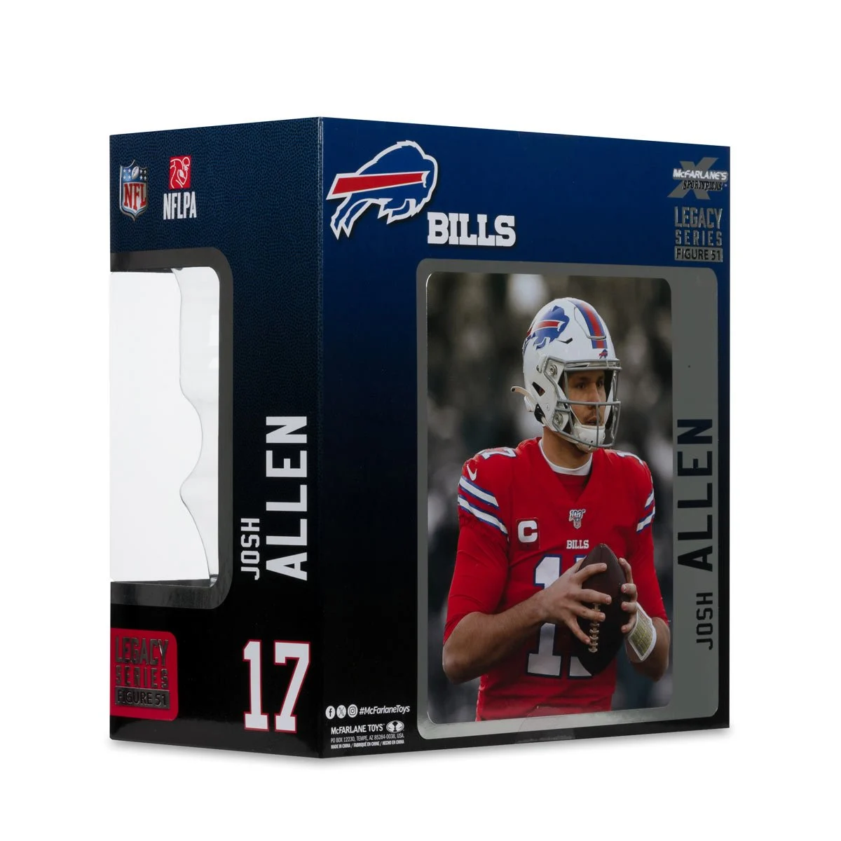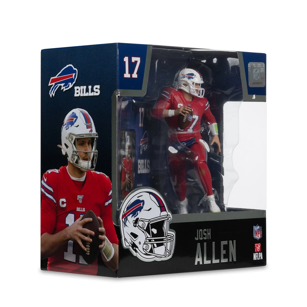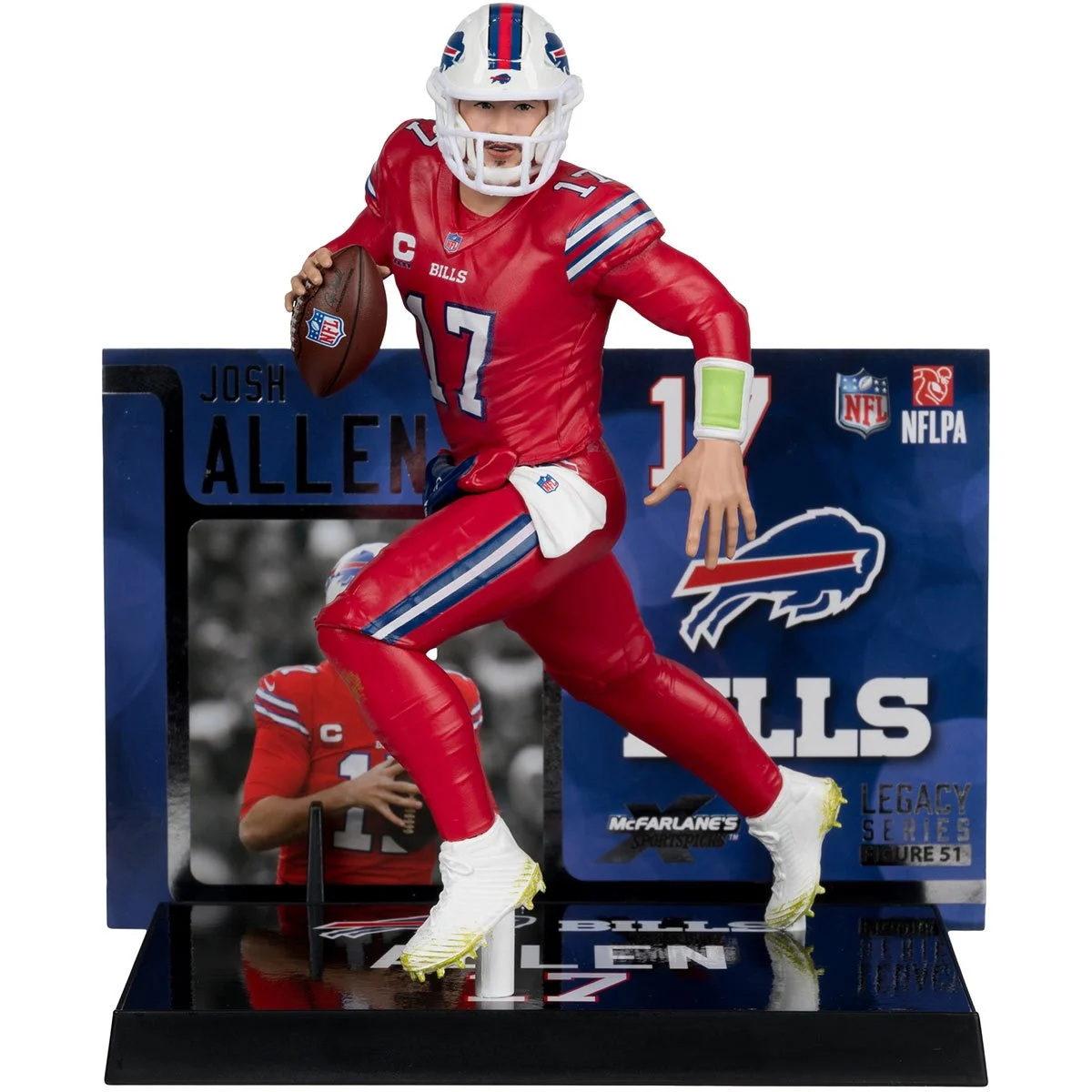 The NFL SportsPicks 2025 Buffalo Bills Josh Allen Red Color Rush Jersey 7-Inch Posed Figure features the QB scrambling and surveying his options. The figure also comes with a player card back drop, player and team display base, and is packaged in a window display box. Known for his strong arm, mobility, and playmaking ability, Allen has emerged as one of the top quarterbacks in the league. Allen was Bills’ 7th overall pick in the 2018 NFL Draft. His athleticism and physicality have made him known for his ability to make big plays both through the air and on the ground. In 2023 Allen set the record for most rushing touchdowns by a quarterback in a single season with 15. Allen led the Bills to multiple playoff appearances, including an AFC Championship game in 2021 when he had the highest passer rating in a single postseason (149.0).