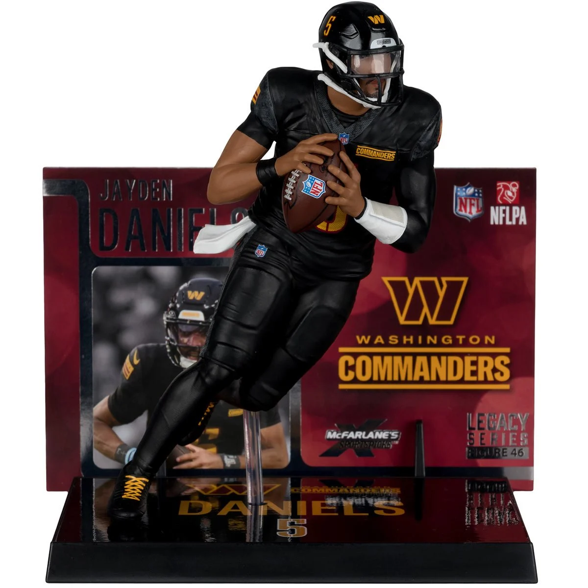 The NFL SportsPicks 2025 Washington Commanders Jayden Daniels Alternate Black Uniform 7-Inch Posed Figure features the star QB running and surveying his options downfield. The figure also comes with a player card back drop, player and team display base, and is packaged in a window display box. Jayden Daniels is the quarterback for the Washington Commanders, drafted second overall in 2024 after winning the Heisman at LSU. In his rookie season, he threw for 3,568 yards, ran for 891, and led the team to the NFC Championship, earning Offensive Rookie of the Year honors.